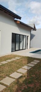 Casa de condomínio com 3 quartos, sendo um suíte, sala, cozinha americana, pequena piscina, portão eletrônico, área verde ao fundo, rua asfaltada paralela à Palavrada Vida.